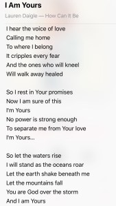 There was even this one music video that I was writing about, mainly to young women. All of the labels we give ourselves were written on a wall, when at the end of the video, water began to pour down the wall…washing all of the names away (You Are More, Tenth Avenue North).