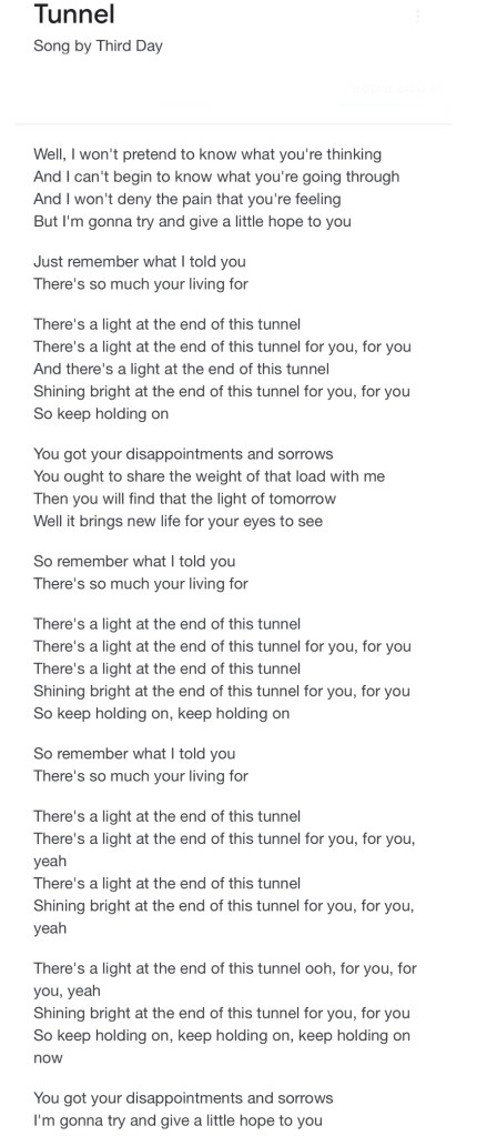 One of the first songs I thought of after reading this devotion is from Third Day, “There’s a light at the end of this tunnel for you.”